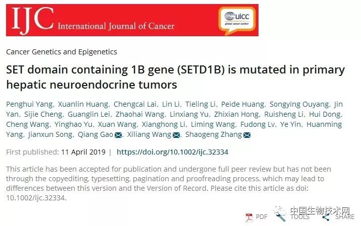 近日,肿瘤学领域老牌杂志International Journal of Cancer在线发表了中国人民解放军总医院第五医学中心肝胆外科团队完成的一项肝脏罕见肿瘤研究成果“SET domain containing 1B gene(SETD1B) is mutated in primary hepatic neuroendocrine tumors”该研究采用全外显子测序,对来自全国26家医院的肝脏原发神经内分泌肿瘤(Primaryhepatic neuroendocrine tumors, PHNETs))样本进行了WES测序分析,发现SETD1B基因具有和TP53相同的突变频率,且显著高于其余基因,接着分析了SETD1B基因信息、保守性、空间结构预测、数据库信息,进一步针对SETD1B基因出现的3种突变形式(S487L、C931Y、A1054del)开展了功能研究,结合患者临床信息得出结论SETD1B 基因突变患者预后更差,有望成为PHNET潜在的诊断、预后分子标志物及治疗药物靶标。