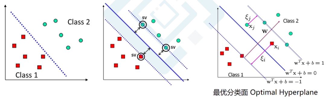 如上图所示,在二维图中是一条直线,在多维高维空间里则是一个超平面。通过运用数学规划和优化算法,让正负样本到超平面的距离尽可能的远,从而找到最优分类面。