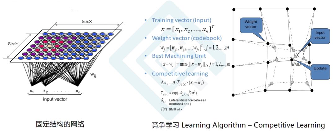 其核心机制是竞争学习。首先根据训练数据的样本大小和特征的维度,来构造初始SOM网络的模型结构,上面的每一个神经元通过不同的群众向量来表达;之后基于竞争学习的更新策略不断迭代更新,移动神经元的位置形成不同的BMU,最大程度靠近所属聚类。