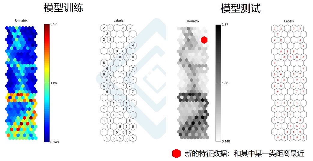在模型测试时,将新的特征数据(即需要测试的样本)放到SOM U-matrix模型计算后,其位置如上图右红点所示,与八种故障类型的标签进行对比可判断出其属于第四类——外圈故障。