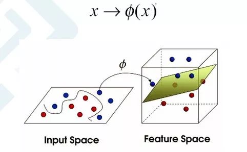 如图所示,左边图样本特征在二维空间里是不可线性可分的,但是把它映射到高维空间中,就以找到一个平面将其分开。