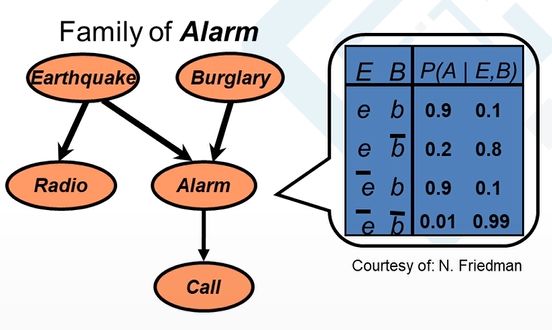 如上图所示,节点表示随机变量,箭头表示条件依赖,有向边给出因果关系。通过统计所有的依赖关系,得出条件概率分布图。