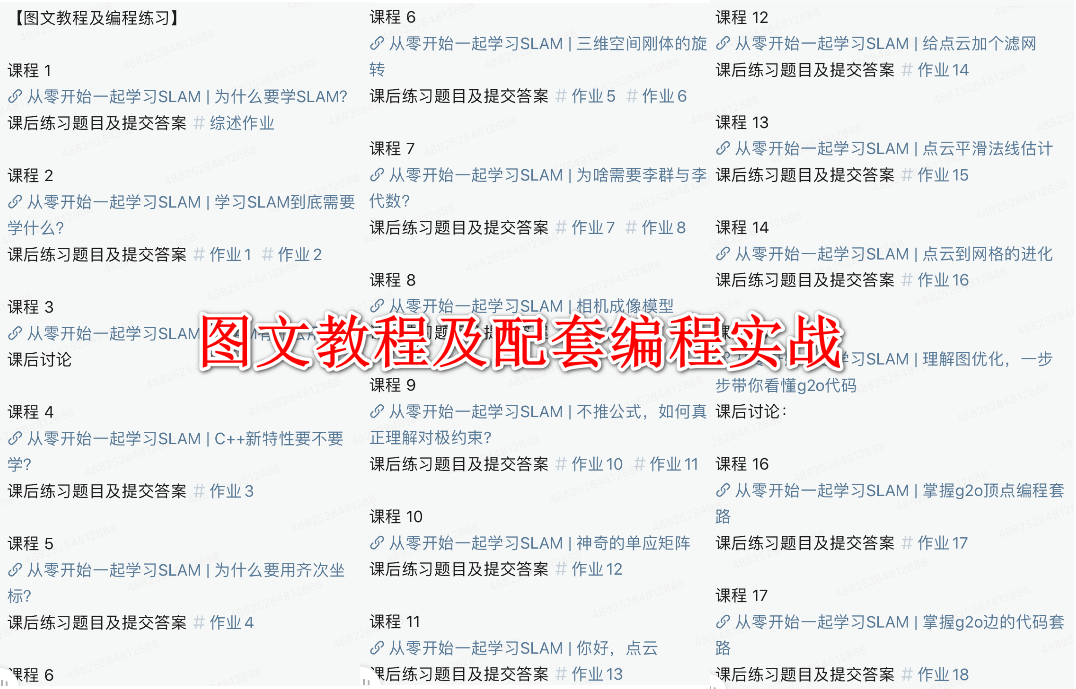 时间不等人,万事早为先。学习切忌单打独斗,一个良好的学习圈子能够帮助你快速入门,交流讨论才能少走弯路,快速进步!加入SLAM学习星球,把握时代的风口,和国内外优秀的SLAM研究者一起交流进步,甚至找到理想工作。3天内无条件退款。目前星球已经讲解了6次 ORBSLAM2 系列视频教程,等你来哦