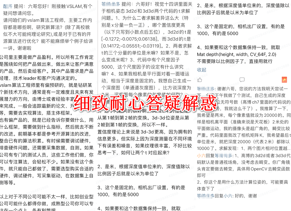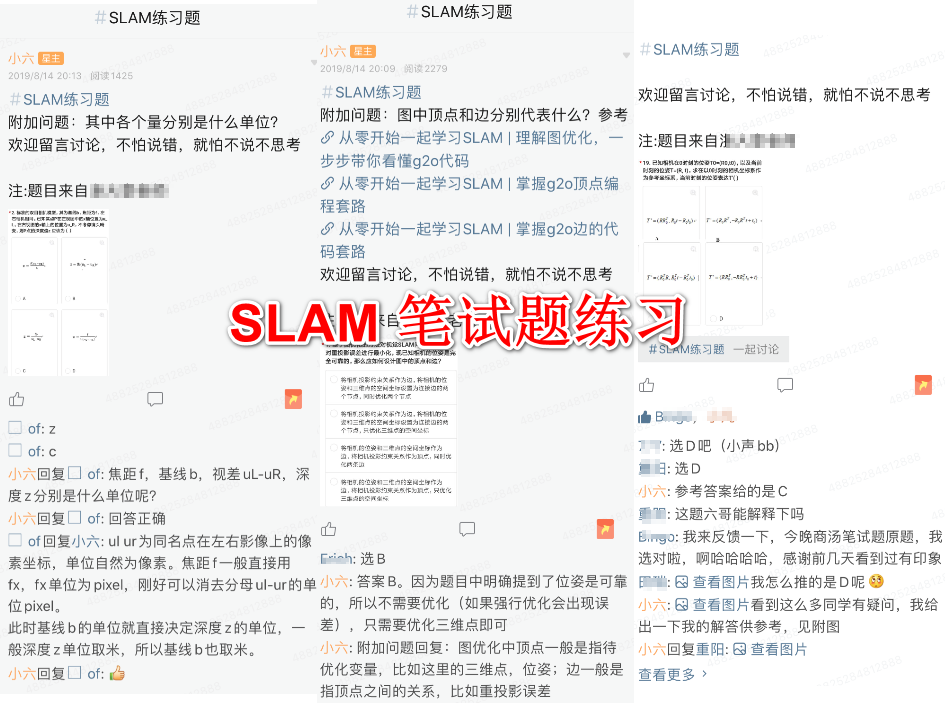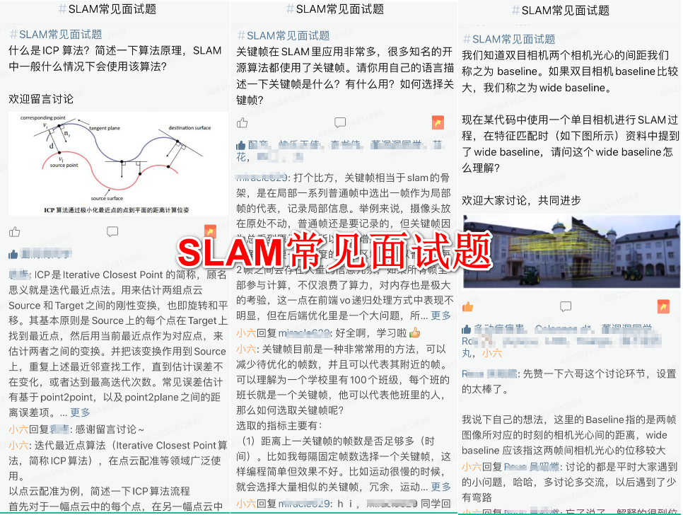 4、精选SLAM常见面试题,定期发布在星球里,引导大家讨论,并提供参考答案,帮助找工作的同学从容面试。目前已经有几十条SLAM常见面试题目和详细解答。