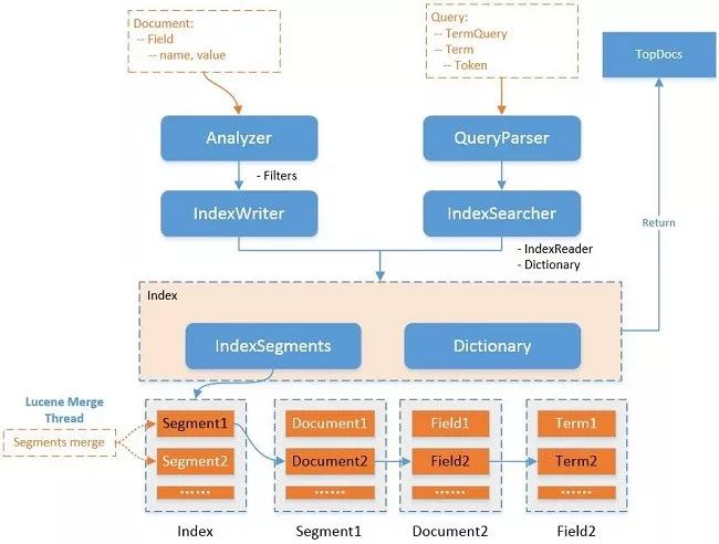 一个Lucene索引包含多个segments,一个segment包含多个文档,每个文档包含多个字段,每个字段经过分词后形成一个或多个term。