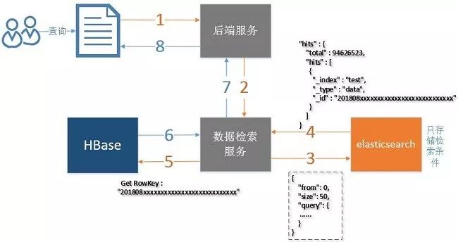 ES仅提供字段的检索,仅存储HBase的Rowkey不存储实际数据;