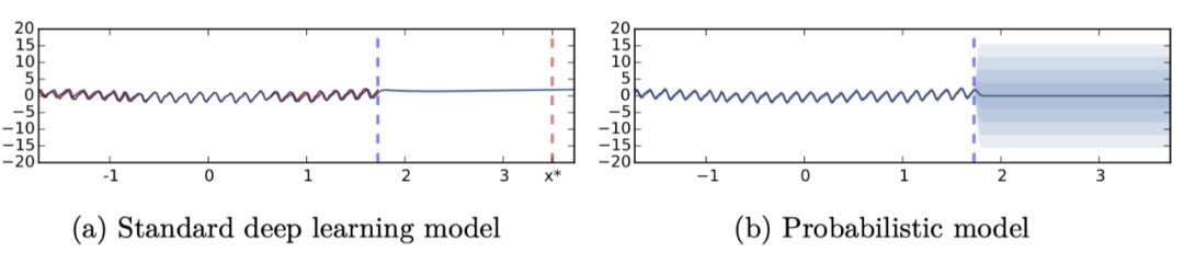 ,传统的深度学习模型会给出确定的预测,如左图红色虚线所示;而概率模型则会对未知的测试部分均采用概率分布来表示,如右图蓝色阴影部分所示,在数据集不能学习到准确的数据分布的情况下(当然实际所用的所有数据集都是有限的),很显然引入不确定性更合理,这也是能有效提升模型泛化能力的原因。