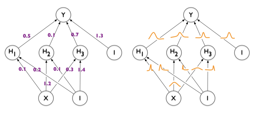 ▲ 图2. 参数固定的传统神经网络(左)以及参数服从概率分布的贝叶斯神经网络(右)