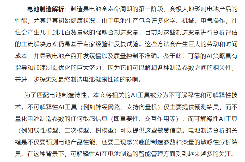 1)对于电池制造,在介绍了电池生产的基础知识后,讨论了基于AI的电池制造数据分析框架和相应的AI工具,以实现有利于电池初始健康性能提升的智能制造。