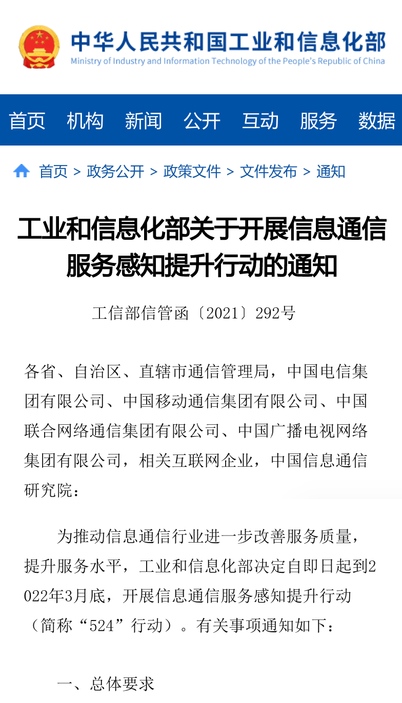 11月5日,工信部发布《关于开展信息通信服务感知提升行动的通知》决定,自2021年11月至2022年3月,开展信息通信服务感知提升行动(简称“524”行动),聚焦APP侵害用户权益专项整治、优化企业个人信息处理规则和优化开屏弹窗信息展示方式等。
