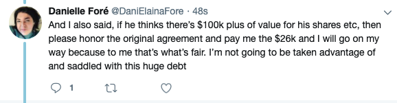 Daniel Foré 还说道,”如果 Cassidy 认为他的股份有 10 万美元以上的价值,那么请履行原来的协议,支付给我 2.6 万美元,我会离职走人。“