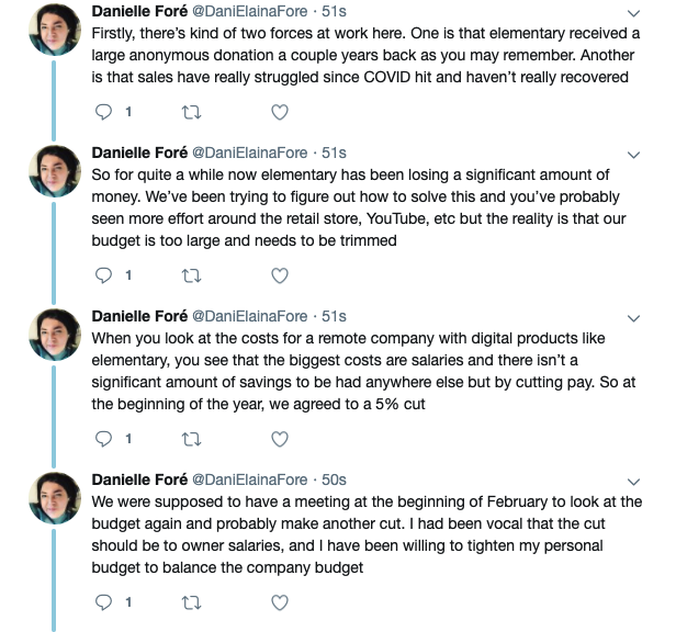 当你看一下像 Elementary 这样拥有数字产品的远程公司的成本时,你会发现最大的成本是工资。除了减薪,没有其他地方可以节省大量的资金。所以在年初,我们公司内部同意削减员工 5% 的工资。