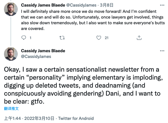 对于 Daniel Foré 单方面的长文”状告“,Cassidy James Blaede 的回应显得很简单,”存在分歧,然后我被告知律师正在参与其中。有人建议我不要透露细节,但我相信我们会解决这个问题。“
