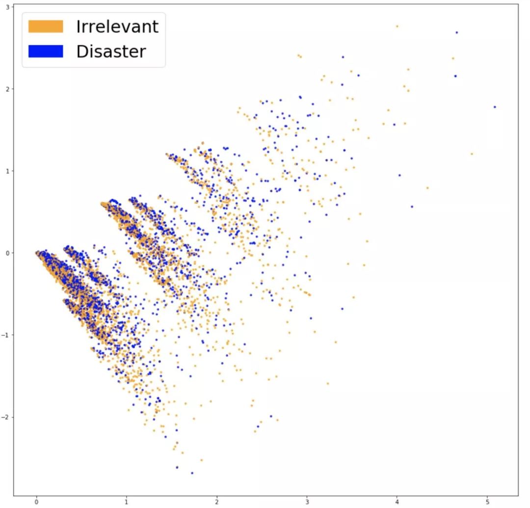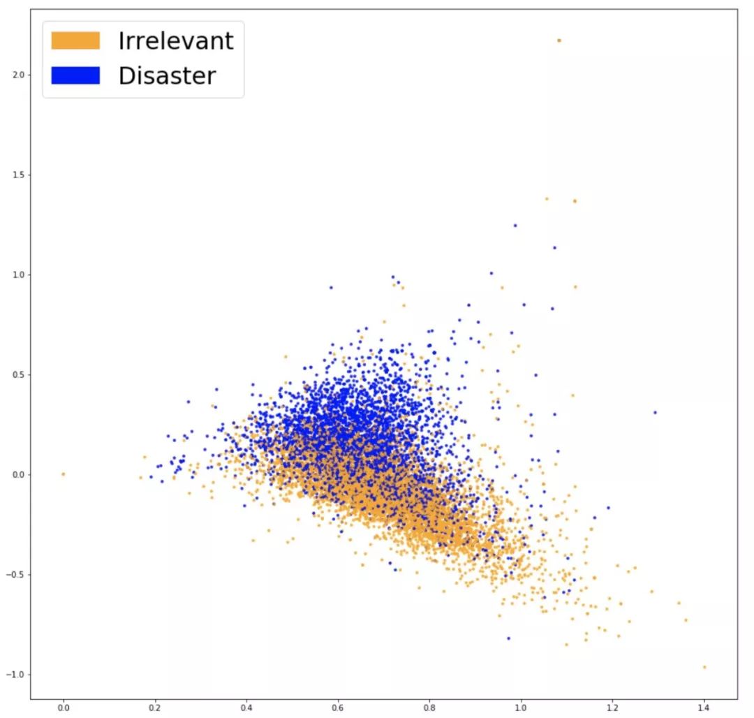 为了看出嵌入的工作是否真正抓住了和问题相关的信息(比如推文是否与灾难相关),有一个好方法是将它们可视化,然后观察结果是否有很好的分布。考虑到词表通常很大,而且用 20000 维的数据做可视化是基本不可能的,所以我们使用了 PCA 这种技术将数据降到二维。绘制如下: