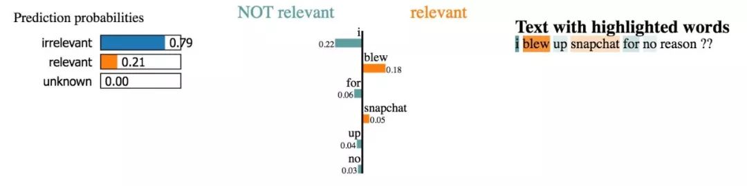 为了验证模型并解释它的预测结果,我们需要明确模型用以进行判断的那些词汇。如果我们的数据有偏差,而分类器在样本数据中却能做出准确预测,那这样的模型就无法在现实世界中很好地推广。