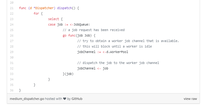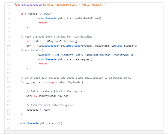我们修改了Web请求处理程序,创建一个带负载的jobstruct实例,发送到JobQueue通道,便于作业者去拾取。