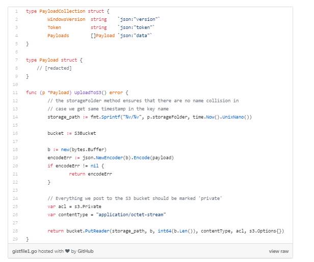 首先通过创建一些structure,定义通过POST调用来接收到的web请求负载,还有一个上传请求负载到S3 bucket的函数。
