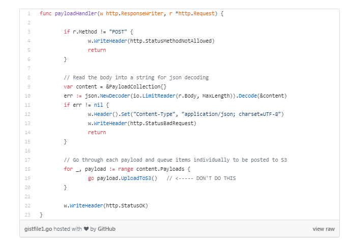 上面的方法在几个方面都不好,没有办法控制我们正在大量生产的Go程序要产生多少个例程。由于我们每分钟收到100万个POST请求,理所当然的,这段代码很快就崩溃了。