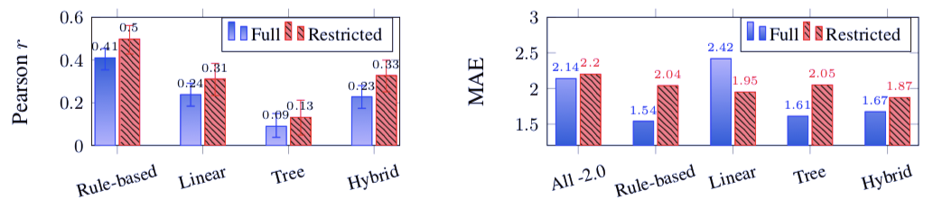 基于规则的、线性的、树结构的和混合模型的 Pearson r 分数和绝对平均误(Mean Absolute Error)分数。