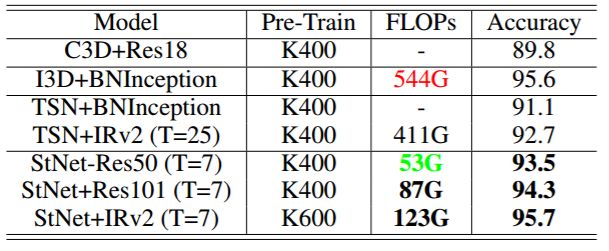 表 3:StNet 和几种最先进的基于 2D / 3D 卷积的解决方案的比较。该结果通过在 Kinetics400 和 Kinetics600 的验证集上得到,其仅具有 RGB 模态。