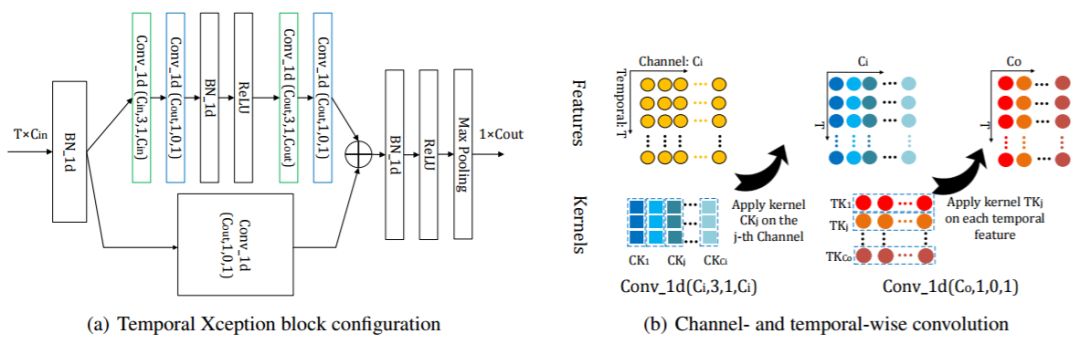 图 3:时间 Xception 块(TXB)。我们提出的时间 Xception 块的详细配置如(a)所示。括号中的参数表示 1D 卷积的(#kernel,kernel size,padding,#groupss)配置。绿色的块表示 channel-wise 的 1D 卷积,蓝色的块表示 temporal-wise 的 1D 卷积。(b)描绘了 channel-wise 和 temporal-wise 的 1D 卷积。TXB 的输入是视频的特征序列,表示为 T×C_in 张量。通道 1D 卷积的每个卷积核仅在一个通道内沿时间维度应用。Temporal-wise 的 1D 卷积核在每个时间步骤中跨所有通道进行卷积。