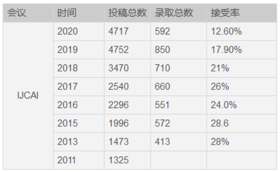去年,总共有4204篇论文投稿,有587篇论文被录取,论文接收率为13.9%。2021年投稿的论文总量,相对于2020年的4717篇下降了10%,这也是近五年来IJCAI 论文投稿量首次出现同比下降的情况。