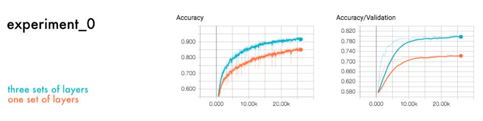 你可以通过点击在菜单栏中的Kernel > Restart & Run All 来运行这些脚本。接着再瞥一眼Tensorboard中的训练记录。你会发现有很多层的多准确了15%。较少层的拟合度低 — 证明它学的还不够。