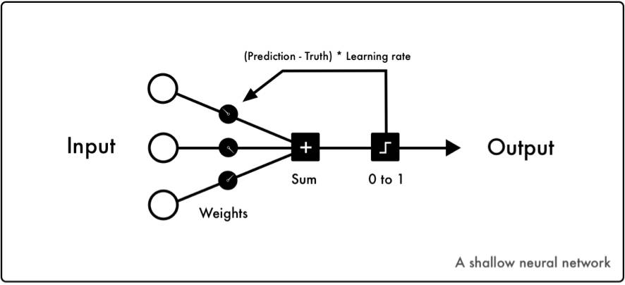 浅层神经网络 输入-权重-加和-判断 –> (预测值-实际值)*学习率
