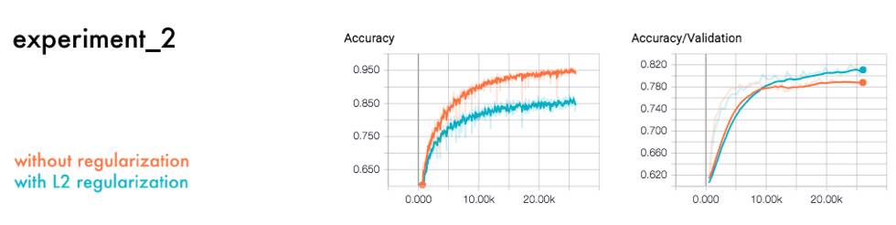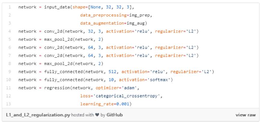 另一个流行的预防过拟合的方式是在每一层中运用L1 或L2 正则方程。