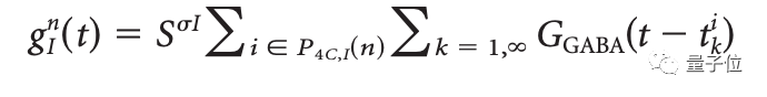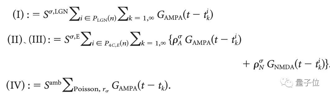 而E电导率gE^n(t)是四个突触传导的总和,分别来自LGN,4Cα层,第6层和大脑或身体其他部位的神经调节的影响。