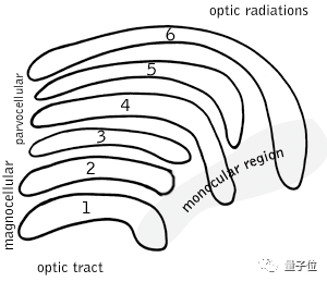 灵长类动物的LGN有六层,其中第1、4、6层接收一只眼的信息,第2、3、5层接收另一只眼的信息。