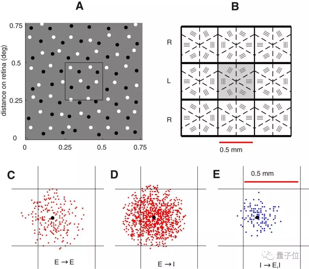 模型的主要组成部分是位于约5°偏心率的猕猴初级视皮层(V1)的一小块4Cα层。研究人员们将两片投射到4Cα区域的LGN细胞,以及第6层输出和4Cα的反馈层都进行了建模。