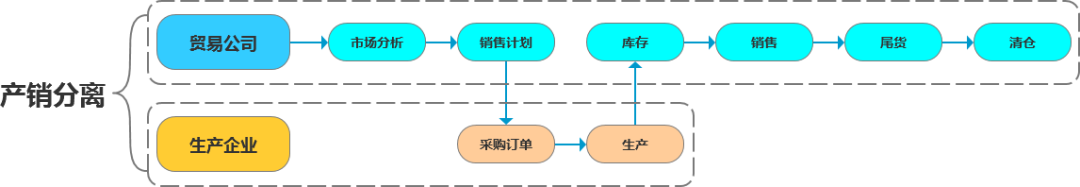 随着市场的不断发展,销售模式的多样性,以及竞争的加剧,自产自销的工厂逐渐跟不上市场的变化,产销一体逐渐走向了产销分离,让专业的人去做专业的事情,演变出了: