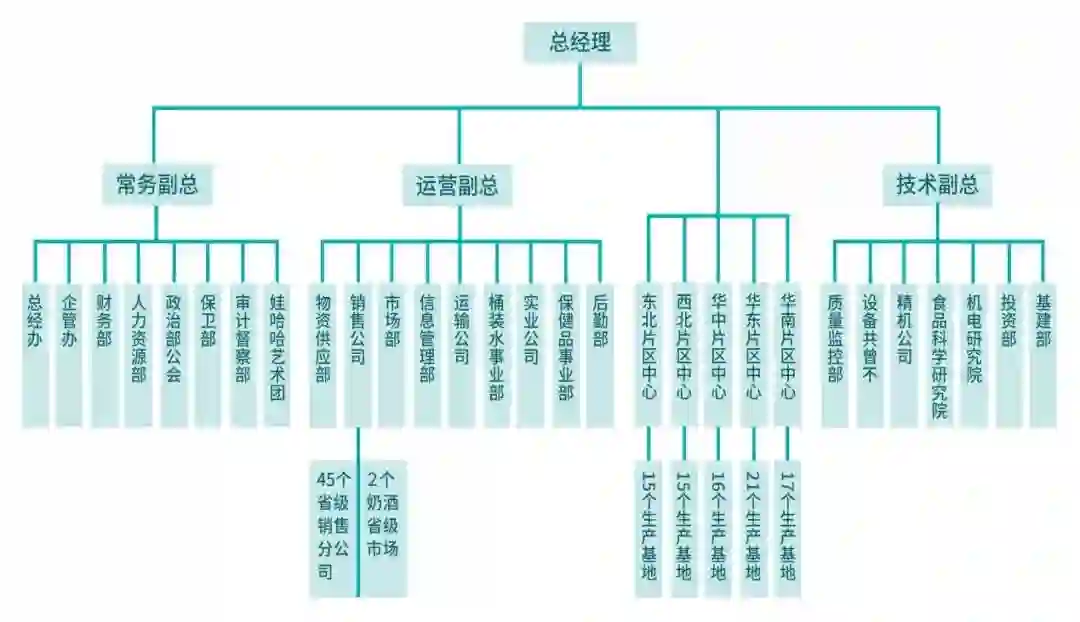 过去很长一段时间,娃哈哈的组织结构更扁平,连分管下面各业务部门的副总都没有。