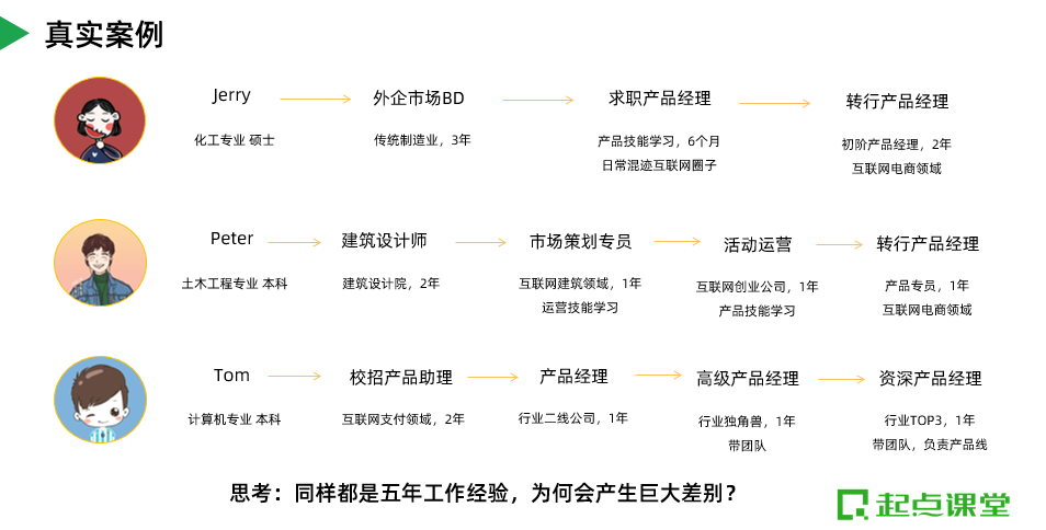 课程中,明瑞老师将带领大家一起思考:同样都是五年工作经验,以下真实案例的三个人,为何会产生巨大的差别?
