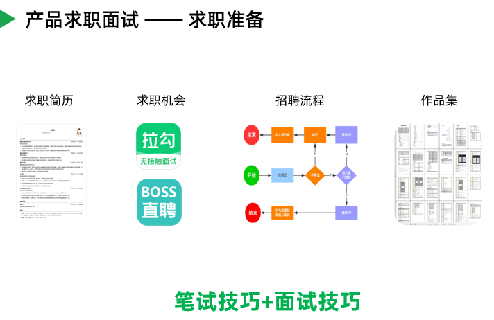 在我们正式去求职产品经理之前,需要做这么几个准备工作:求职简历+求职机会+招聘流程+作品集+笔试技巧+面试技巧。