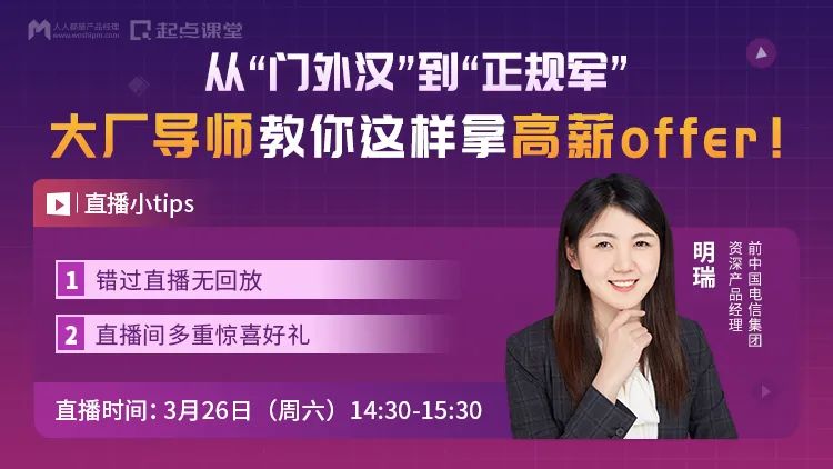 还是不清楚到底该怎么着手做?没关系,针对以上这些问题,3月26日下午14:30-15:30,【人人都是产品经理】联合【起点课堂】特邀原中国电信集团资深产品经理@明瑞,做客“产品经理入门公开课”。