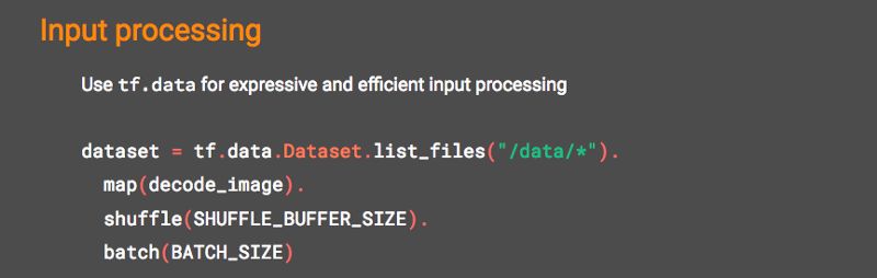 你用 NumPy 做的是什么?如果你想在 TensorFlow 中执行同样的操作,但是却“怒退”(rage-quit),则 tf.data 命名空间可以帮助 TensorFlow 中的输入处理更具表达能力、更高效。tf.data 为你提供与训练同步的快速、灵活且易于使用的数据工作流。