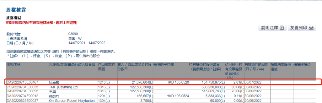 36氪获悉,港交所权益披露资料显示,7月8日,红杉中国减持约2107万股美团股票,价值约39亿港元,持股比例由3.19%下降到2.81%。