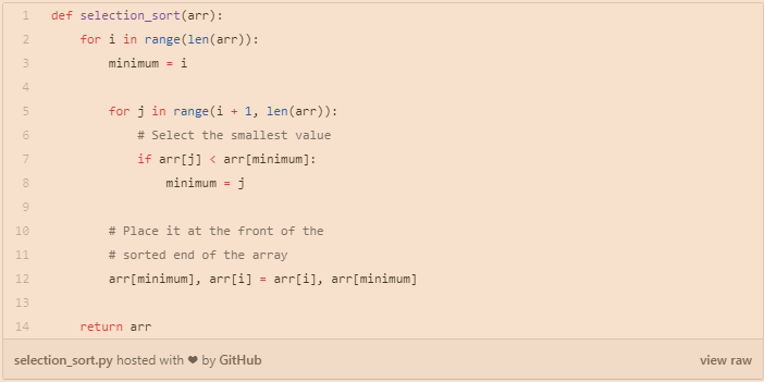 选择排序也很简单,但常常优于冒泡排序。如果您在这两者之间进行选择,最好默认选择排序。通过选择排序,我们将输入列表/数组分为两部分:已经排序的子列表和剩余要排序的子列表,它们构成了列表的其余部分。我们首先在未排序的子列表中找到最小的元素,并将其放置在排序的子列表的末尾。因此,我们不断地获取最小的未排序元素,并将其按排序顺序放置在排序的子列表中。此过程将重复进行,直到列表完全排序。