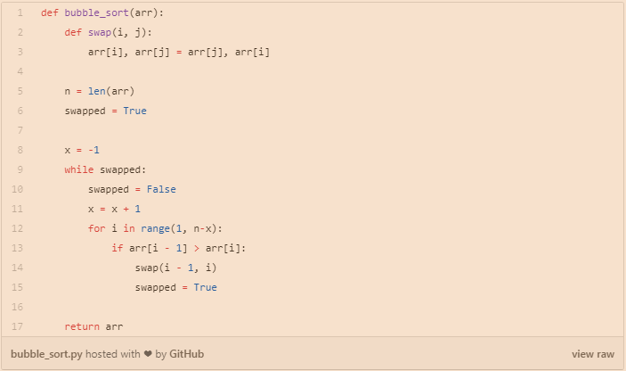 冒泡排序通常是在CS入门课程中教的,因为它清楚地演示了排序是如何工作的,同时又简单易懂。冒泡排序步骤遍历列表并比较相邻的元素对。如果元素顺序错误,则交换它们。重复遍历列表未排序部分的元素,直到完成列表排序。因为冒泡排序重复地通过列表的未排序部分,所以它具有最坏的情况复杂度O(n^2)。