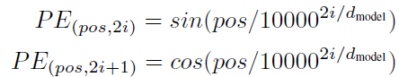 在我们之前使用CNN或者RNN模型进行文本建模时,模型内部已经考虑到序列的序列位置了,而上述的self-attention,仅可以认为是一个词袋模型,未考虑到词的位置信息。为了解决这个问题,此处在input中,除词语的embedding外,再额外添加位置编码信息,具体计算依据以下方式,主要依据sin和cos的方式锁定单词位置: