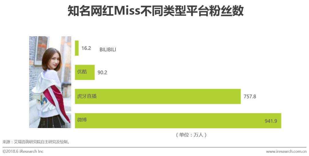 如知名的游戏主播Miss,其作品多为直播以及游戏相关视频,因此在斗鱼、优酷、BILIBILI等直播及在线视频网站和平台上均能搜索到她的作品。其子频道总播放量更是达到了6.5亿。同时为了获得更多的关注,在以微博为典型的社交平台上上传自己的作品也是网红们的不二选择,以Miss为例,其微博粉丝数已达940万人,超过了其直播平台上757万关注数。