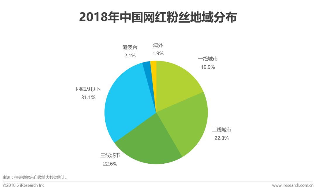 在粉丝性别方面,男性粉丝数目相较于女性有着更大的占比。截至2018年5月,网红粉丝男性占比为61.4%,与2017年占比持平。从地域角度分析,在整体分布保持基本相同的情况下,三四线城市用户有微小的扩大,从去年的53%增值54%,百分比增加1%。用户地域分布下沉趋势不断扩大。