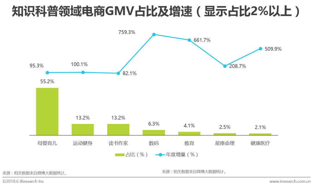 在知识科普领域方面,其下垂直领域通过电商的收入表现也十分令人瞩目。母婴育儿在去年GMV占整体知识科普领域收入的55%。而其他领域虽然占比不及母婴类,但仍保持了高速的年增长率,其中数码类、教育类和健康医疗类GMV增速均超过了500%,分别达到759%、661.7%及509%。
