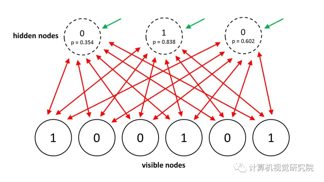 对于正相位,首先将可见单元的数据矢量钳位。然后计算所有可见和隐藏单元对的<ViHj>的确切值。对于每个连接的单元对,对小批量中的所有数据<ViHj>求平均。