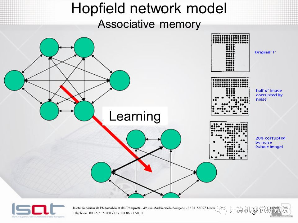 循环网络的非线性单元通常很难分析。它们可以表现为不同的方式:稳定到稳定的状态,振荡,或遵循不可预测的混沌轨迹。一个 Hopfield 网络由二元门限单元组成,它们之间有连续的连接。1982 年,John Hopfield 认识到,如果连接是对称的,就有一个全局能量函数。整个网络的每个二进制「结构」都有能量,而二进制阈值的决策规则使网络可以得到能量函数的最小值。利用这类计算的一种简洁方法是使用记忆作为神经网络的能量最小值。使用能量最小值来表示记忆从而内存可寻址。可以只知道一个项目的部分内容来访问这个项目。这对硬件损坏是极大的。