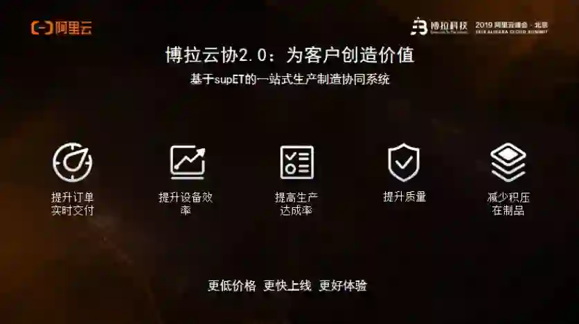 正如张建锋所说:“阿里云自己不做SaaS,让大家来做更好的SaaS”,博拉云协就是融合阿里云数字化、智能化理念的生产制造协同SaaS系统,通过网络协同实现精准管理,健全规范提升效率;通过数据智能实现持续优化,量化问题持续改善。和博拉云协1.0相比,博拉云协2.0除了对业务进行全面升级之外,最大的特点还在于建设和实施方式有了质的飞越,不仅可以通过容器部署的方式,实现本地容器化和云应用托管无缝切换,而且还依托supET,快速搭建行业级工业互联网平台,满足产业集群的需求。与此同时,博拉云协在聚焦工业“业务运行”过程中,不断沉淀工业知识组件、算法组件和原理模型组件,形成以“工业算法”为核心价值的博拉视界,为工业企业深度挖掘价值。