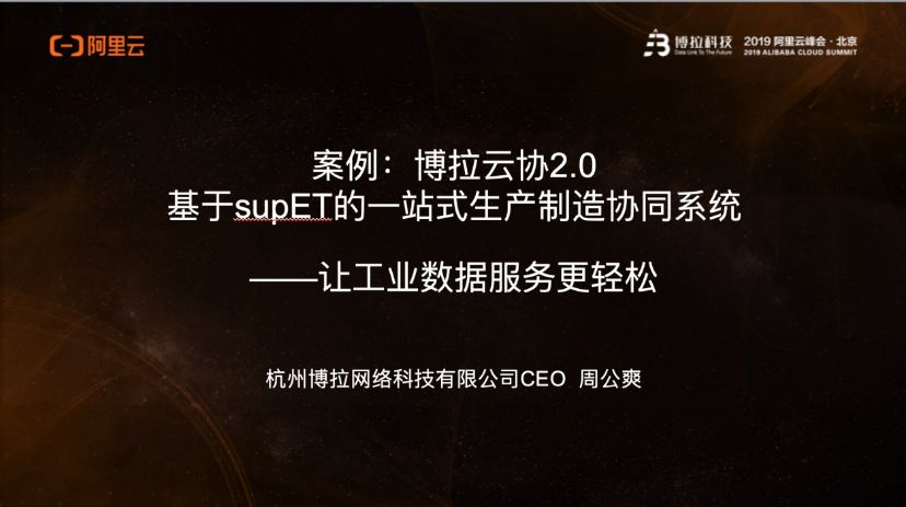 物联网专场的主题为“生产力云化重塑产业竞争力”。2019年是阿里云成立的第十年,也是数字经济、工业互联网高速发展的关键一年,如何推动信息技术与实体经济深度融合,备受行业关注。致力于成为工业数字化服务“淘宝网”的supET,通过“1+N”跨界融合,打造1个基础性平台和N个行业级区域级企业级平台,服务大型企业,赋能中小型企业,通过数字产业化推动工业产业数字化。作为supET重要合作伙伴,博拉科技CEO周公爽在峰会上发布了基于supET的一站式生产制造协同SaaS系统——博拉云协2.0,让工业数据服务更轻松。
