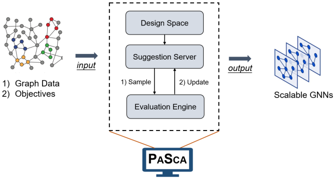 区别于现有的大规模图神经网络系统,本文提出的 PaSca 是一个端到端的系统。如图 4 所示,系统的输入有两部分组成:1)图数据 ;2)搜索目标(预测性能、内存占用、训练以及预测效率等)。